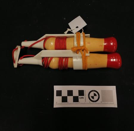 Fabrikstillverkade isdubbar med trähandtag, rött snöre, vita plastdelar och texten "Hansa-dubben". Med tusch: "LISSELL".