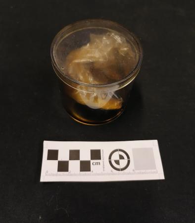 Genomskinlig plastburk. Innehåller en metalltub och en glasflaska som läcker mörk vätska.
