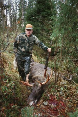 Baksidetext: Jens Harberg med nyss fälld älg i Lemland 1989.