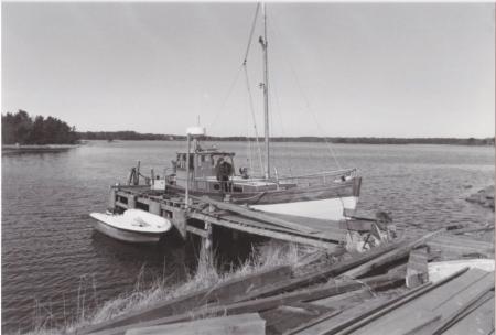 Baksidetext: Karl Larsson laxfiskebåt i Saltik. April 1984