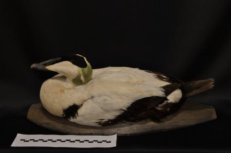 Uppstoppad guding på svart botten. Benen (ena av) sticker genom botten. Huvudet är lite tillbakasjunket. Teckningen är svart/vit/grön. Vänster vinge är lös. Märkt R.L Fryst 19.3.1998, 1 månad -30 grader.