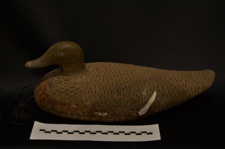 Åda med kropp av kork och huvud av trä. Kroppen klädd med nylonstrumpa som är målad. Huvudet fäst genom kroppen. Metallplatta undertill.