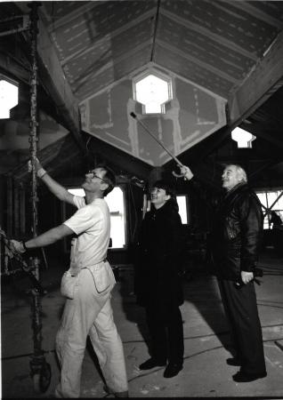 Svartvitt fotografi på Allen Mattsson och Marina Airo som ser över museibygget i Eckerö. Målaren Tore Nykvist står vid en byggnadsställning till vänster i bild. Allen Mattsson pekar med käppen sin mot taket.