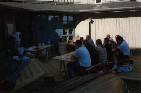 Färgfotografi på en grupp människor (icke namngivna) som deltar vid en kurs i uppstoppning av fåglar på Ålands Jakt- och Fiskemuseums innergård.
