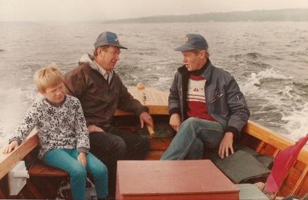 Färgfotografi på två män och en pojke (namngivna på baksidan) som sitter i en båt som körs av någon okänd person.