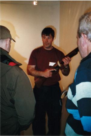 Färgfotografi på en man (namngiven på baksidan) som står med ett gevär i händerna på jaktens dag på museet.