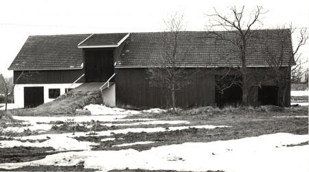 Svartvitt fotografi på en lada på okänd ort.