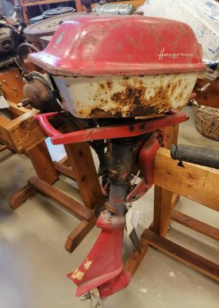 Utombordsmotor av märket Husqvarna. Tidigare dokumentation eller katalognummer har ej hittats.