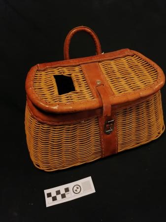 Flätad korg med lock och läder detaljer. Tryckt finns måttstock för fisk samt texten "MADE IN BRITISH HONG KONG". Innehåller fisketillbehör.