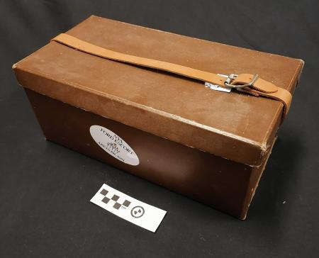 Brun kartonglåda med läderrem. Innehåller fiskeredskap.