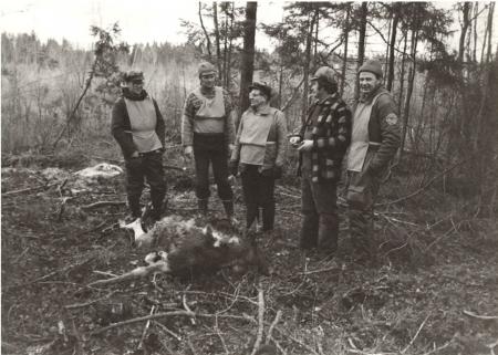 Baksidetext: Älg som nyligen fällts i Lemland 1986. Fr. V. Ingmar Engblom, Sune Mansén, Alf Johansson, Sune Eriksson, Bengt Karlsson