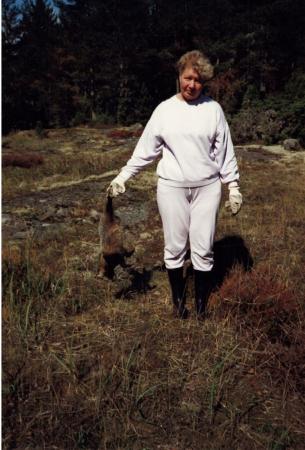 Baksidetext: Ann-Lis Harberg visar upp en nyss fångad mårdhund. Lemland 1991