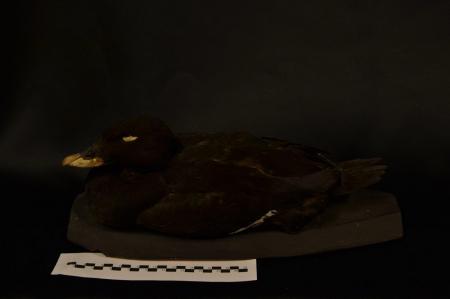 Uppstoppad svärthane på svart träbotten. Ser gammal ut. Benen genom botten.