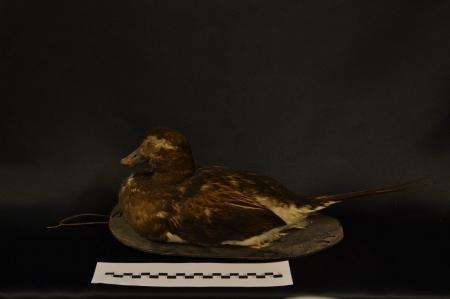 Två vettar. Al-fågel par. Hanen (A) med låga sjärtfjädrar, honan (B) mindre. Bägge har brunspräcklig teckning, honan något ljusare. Mått: A: L 42cm B13 cm H13 cm. B: L28,5 cm B13cm H 10,5cm.