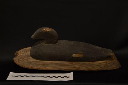 Svärthona av trä på fjöla (bottenplatta). Undertill ett korkflöte. Hålet bakpå fjölan är för att fästa en ankare (tex en sten) vid. Hålet frampå fjölan är för att knyta ihop vettarna med.