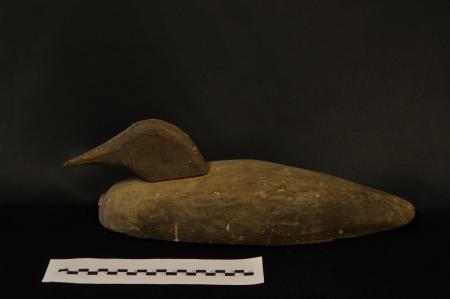 Skrake av trä. Mycket spetsig näbb. Urgröt kropp, nu fylld med kork. Saknar egentlig fjöla. Längst fram en järnhake.