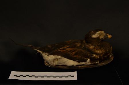 En uppstoppad al-hane med lång stjärt. Huvudet snett.