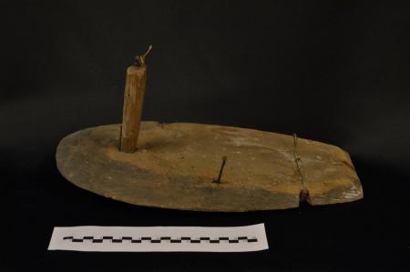 Trästomme för fjädervette. Saknar huvuddel, har istället en spik längst upp. Har även en spik som sticker upp på ena sidan.