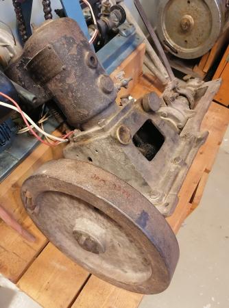 Inombordsmotor, tillverkad av Wickströms Motorfabriks Ab. No 7608. 4-5 hästkrafter. Motorn är rostig och söndrig på vissa ställen.