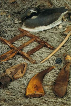Färgfotografi på ett antal föremål som poserats på ett nät i en sorts stillebenkomposition.