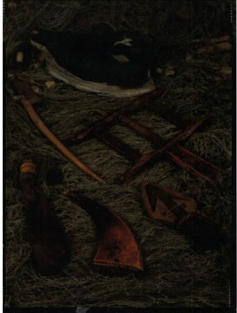 Färgfotografi på ett antal föremål som poserats på ett nät i en sorts stillebenkomposition. Fotografiets ljusa delar är genomskinliga. Fotografiet är troligen menat att tittas på med hjälp av ett ljusbord.