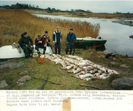 Hösten 1989 var en del av personalen från Nyhamns lotsstation ut till Lågskär på harjakt. Fr.v. lotsen Stig Andersson, kutterförare Sune Karlsson, lotsen J-E Sommarström, lotsålderman P-O Manners samt lotsen Ralf Holmberg.