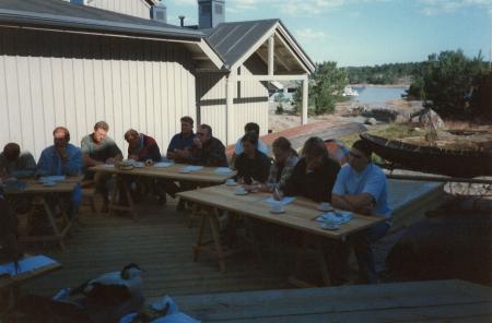 Färgfotografi på en grupp människor (icke namngivna) som deltar vid en kurs i uppstoppning av fåglar på Ålands Jakt- och Fiskemuseums innergård.