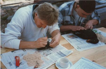 Färgfotografi på en man som arbetar med att stoppa upp en mindre, svart fågel på en kurs i uppstoppning av fåglar som hölls på museets innergård. Även en annan man syns till höger i bilden.