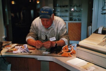 Färgfotografi på Ingmar Berglund (namngiven på baksidan) som står vid någon sorts lottförsäljning på första jaktens dag på museet.